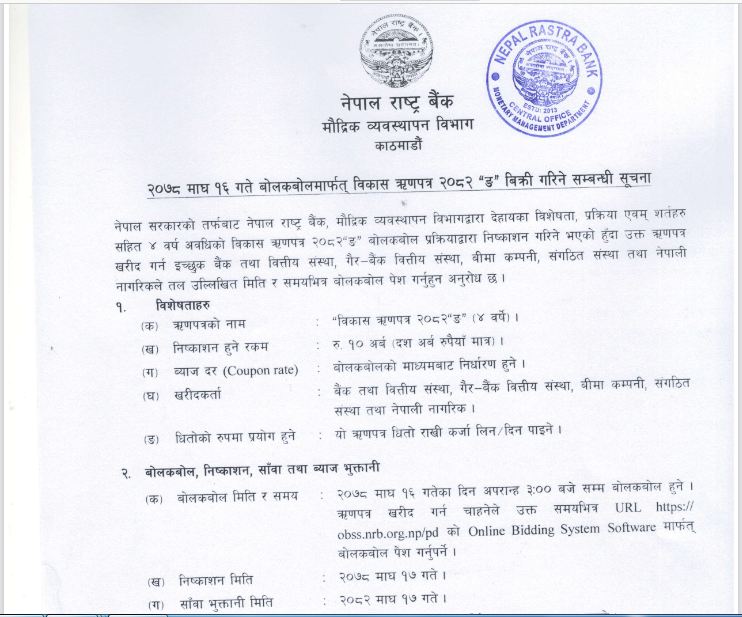काठमाडौं । नेपाल राष्ट्र बैंकले १० अर्ब रुपैयाँको विकास ऋणपत्र विक्री गर्ने भएको छ । राष्ट्र बैंकका अनुुसार माघ १६ गते चार वर्षे अवधिको विकास ऋणपत्र २०८२ ङ विक्री गर्न लागिएको हो ।