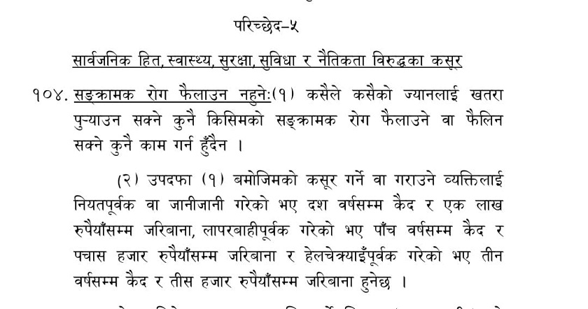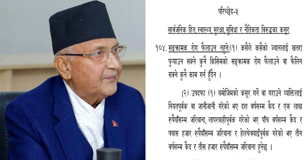 अध्यक्ष ओलीलाई कानुन अनुसार ३ वर्षदेखि १० वर्षसम्मको सजाय हुन सक्ने व्यवस्था छ । परिच्छेद–५ को सार्वजनिक हित, स्वास्थ्य, सुरक्षा, सुविधा र नैतिकता विरुद्धका कसूर अन्तर्गत ओली जेल जान सक्ने छन् । सङक्रामक रोग फैलाउन नहुने उक्त परिच्छेदमा भनिएको छ । कसूर गर्ने वा गराउने व्यक्तिलाई नियतपूर्वक वा जानीजानी गरेको भए दश वर्षसम्म कैद र एक लाखसम्म जरिनावाना हुने व्यवस्था रहेको छ । सो परिच्छेदमा भनिएको छ, ‘कसूर गर्ने वा गराउने व्यक्तिलाई नियतपूर्वक वा जानीजानी गरेको भए दश वर्षसम्म कैद बर एक लाख रुपैयाँसम्म जरिबाना, लापरबाहीपूर्वक गरेको भए पाँच वर्षसम्म कैद र पचास हजार रुपैयाँसम्म जरिबाना र हेलचेक्र्याइँपूर्वक गरेको भए तीन वर्षसम्म कैद र तीस हजार रुपैयाँसम्म जरिवाना हुनेछ ।’
