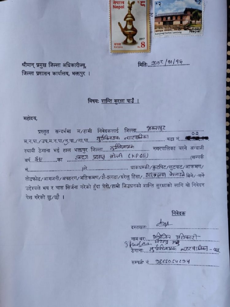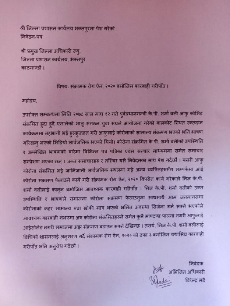 काठमाडौं । नेकपा एमालेका अध्यक्ष केपी शर्मा ओलीलाई संक्रामक रोग ऐन २०२० विपरित कार्य गरेको भन्दै कारवाहीको मागसहित जिल्ला प्रशासन कार्यालय भक्तपुरमा निवेदन परेको छ । सूर्यविनायक नगरपालिका भक्तपुरका अभिजित अधिकारीले संक्रामक रोग ऐन २०२० बमोजिम कारवाही गर्न माग गर्दै आज उजुरी दिएका हुन् ।
