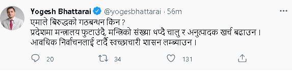 एमालेविरुद्ध पाँच दलीय गठबन्धन एक भएर चुनाव लड्ने समाचार आइरहेको समयमा योगेशको यस्तो धारणा आएको हो । उनले भने, ‘गठबन्धन किन ? प्रदेशमा मन्त्रालय फुटाउँदै, मन्त्रीको संख्या थप्दै चालु र अनुत्पादक खर्च बढाउन । आवधिक निर्वाचनलाई टार्दै स्वच्छाचारी शासन लम्ब्याउन ।’