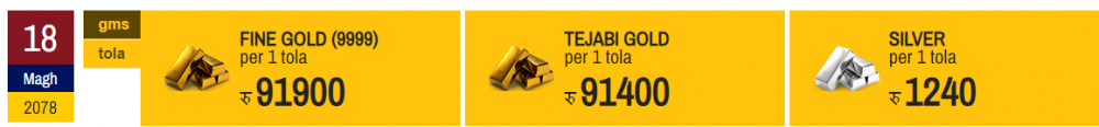 त्यस्तै महासंघका अनुसार आज तेजाबी सुनको मूल्य पनि १ सय रुपैयाँले बढेकाे छ । आज तेजाबी सुन ९१ हजार ४ सय रुपैयाँमा कारोबार भइरहेको छ । साेमबार तेजाबी सुन ९१ हजार ३ सय रुपैयाँमा काराेबार भएकाे थियाे ।