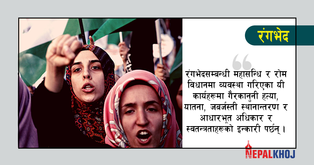 एउटा जातीय समूहले अर्को जातीय समूहमाथि गरिने दमन र प्रभुत्वको संस्थागत शासन प्रणाली रङ्गभेद हो । यो मानव अधिकारको गम्भीर उल्लंघन हो, जसलाई सार्वजनिक अन्तर्राष्ट्रिय कानुनमा निषेध गरिएको छ । बाह्य विज्ञहरूसँगको परामर्शमा गरिएको एमनेस्टी इन्टरनेसनलको व्यापक अनुसन्धान र कानुनी विश्लेषणले प्यालेस्टाइनीहरूविरुद्ध लामो र क्रुर विभेदकारी व्यवहार सुनिश्चित गर्नका लागि कानुन, नीति र अभ्यासका माध्यमबाट इजरायलले प्यालिस्टाइनीहरूविरुद्ध यस प्रकारको शासन प्रणाली लादेको देखाएको छ ।