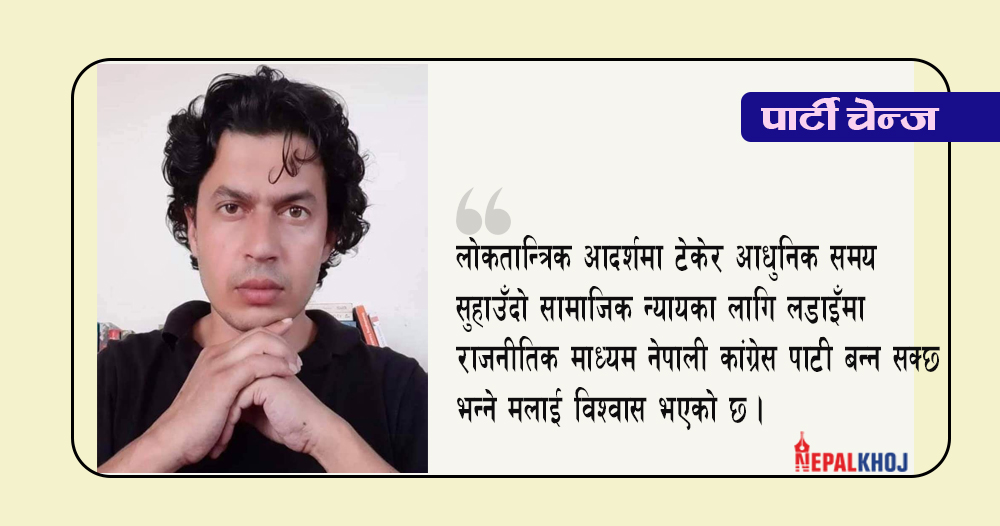 लोकतान्त्रिक आदर्शमा टेकेर आधुनिक समय सुहाउँदो सामाजिक न्यायका लागि लडाइँमा राजनीतिक माध्यम नेपाली कांग्रेस पार्टी बन्न सक्छ भन्ने मलाई विश्वास भएको छ । बीपीका विचार र आदर्शहरुबाट सिञ्चित र लाखौं सुझबुझयुक्त योद्धाहरुको योगदानले नेपालको सबैभन्दा ठूलो र सम्भवतः एकमात्र लोकतान्त्रिक शक्तिका रूपमा स्थापित नेपाली कांग्रेससँग जोडिन पाउनु सधैं मेरो अहोभाग्य ठानेर त्यहीअनुरुप समाजसेवाको भावनामा समर्पित रहनेछु ।