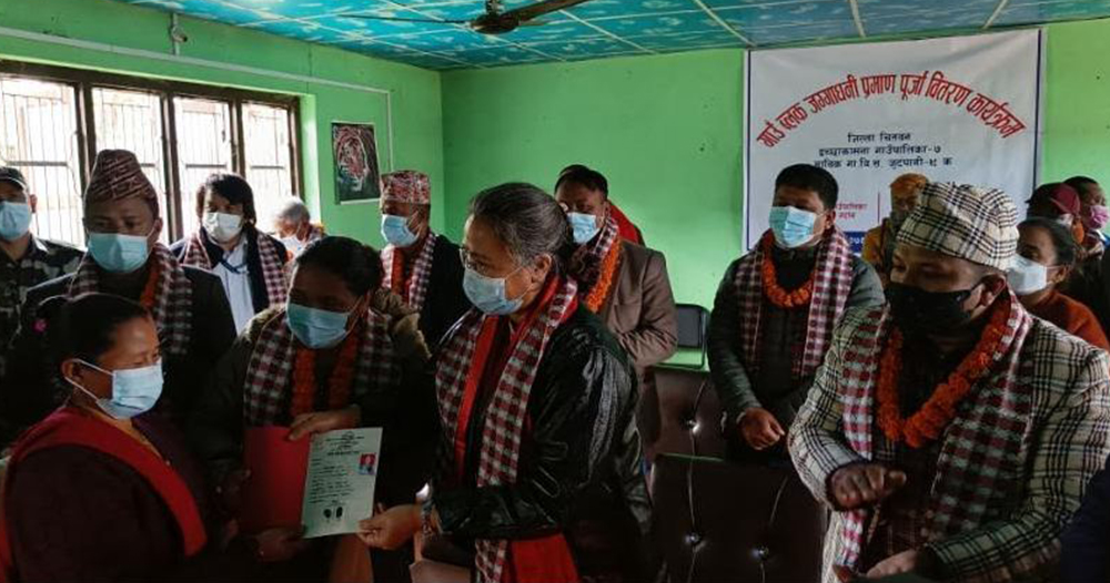 काठमाडौं । भूमि, व्यवस्था, सहकारी तथा गरिबी निवारणमन्त्री शशी श्रेष्ठले चितवन जिल्लाको इच्छाकामना गाउँपालिकाको गाउँव्लकमा रहेका भूमिविहिनलाई जग्गा धनी प्रमाण पुर्जा वितरण गरेकी छन् । आज मन्त्री श्रेष्ठले चितवन जिल्लाको इच्छाकमना गाउँपालिकाको गाउँव्लकमा रहेका ३६ घर परिवारलाई जग्गाधनी प्रमाण पुर्जा वितरण गरिन् ।