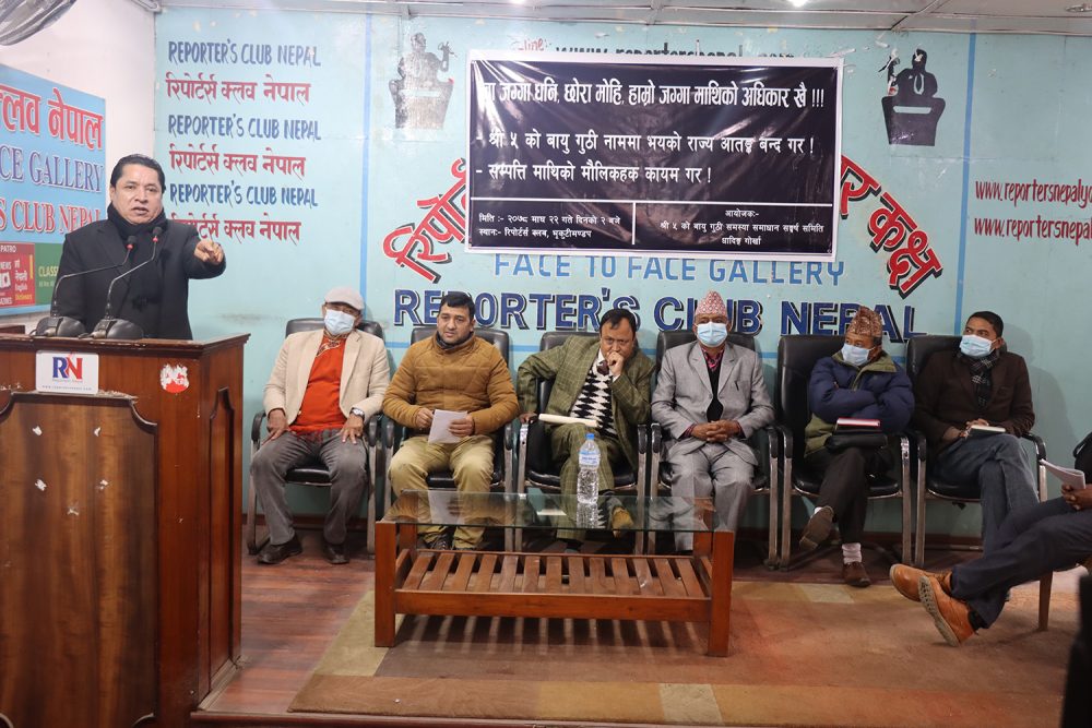 काठमाडौं। श्री ५ को वायु गुठी समस्या समाधान सघंर्ष समिति धादिङ–गोरखाले धादिङ र गोरखा जिल्लाका करिब तीन हजार ५ सय घरधुरीका स्थानीयहरुको गुठी समस्या तत्काल समाधानका गर्न सरकारसमक्ष माग गरेको छ । समितिले ‘बा जग्गाधनी, छोरा मोही’, हाम्रो जग्गामाथिको अधिकार खोई’, ‘श्री ५ को वायु गुठीको नाममा भएको राज्य आंतक बन्द गर, सम्पत्तिमाथिको मौलिक हक कायम गर’लगायतका नारा अघि सारेको छ ।