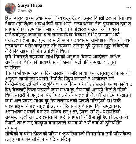 काठमाडौं । नेकपा एमालेका नेता सूर्य थापाले एमसीसी मित्रराष्ट्रले सद्भावका साथ दिएको अनुदान भएको बताएका छन् । उनले आज सामाजिक सन्जालमार्फत अमेरिकी सहायता परियोजनालाई विद्रूप बनाउने काम भएको अरोप लगाए ।