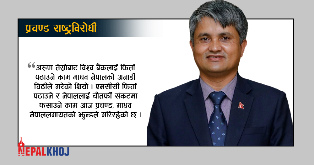 उनले नेकपा माओवादी केन्द्रका अध्यक्ष पुष्पकमल दाहाल प्रचण्ड दुई जीब्रे भएको आरोप समेत लगाए । उनले प्रचण्ड राष्ट्रविरोधी भएको टिप्पणी गरे । उनले भने, ‘कुनै मित्रराष्ट्रले सद्भावका साथ दिएको अनुदानविरूद्द आन्दोलन, कथित संशोधन र विरोधको पाखण्डीपनको भ्रमका पर्दा पनि क्रमशः च्यातचुत पारिँदैछन् । तिनले भविष्यमा जवाफ दिन सक्लान्, अमेरिका वा अरू दातृराष्ट्र र निकायको अनुदान सहयोगलाई यसरी गिजोलेर विद्रूप बनाउने र अस्वीकार गर्ने गैरजिम्मेवार, दुई जीब्रे र राष्ट्रविरोधी कार्य किन गरेको त ?’