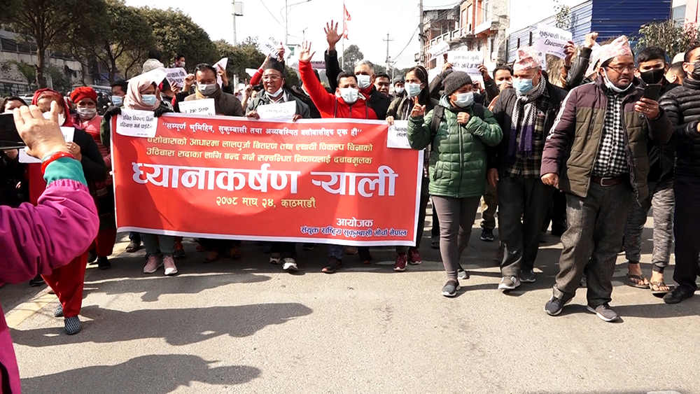 काठमाडौं । बसोवासको आधारमा लालपुर्जा वितरण गर्न माग गर्दै सरकारको ध्यानाकर्षण गराइएको छ । सोमबार संयुक्त राष्ट्रिय सुकुम्बासी मोर्चा नेपालले सो माग गर्दै काठमाडौंको माईतीघरमण्डलादेखि बिजुलीबजारसम्म ध्यानाकर्षण र्याली गरेको हो ।