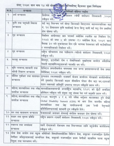 निर्वाचनले आयोगसँगको परामर्शपछि मन्त्रिपरिषदले निर्वाचनको मिति तय गरेको थियो । सरकारले धितोपत्र दर्ता तथा निस्काशन पाँचौ संशोधन नियमावली २०७८ स्वीकृत गर्ने निर्णय गरेको छ । यस्तै राष्ट्रिय परिचयपत्र तथा पञ्जीकरण पहिलो संशोधन नियमावली २०८ र डिजिटल प्रणालीबाट नापनक्सा तथा जग्गा प्रशासनसम्बन्धि सेवा प्रवाह निर्देशिका २०७८ स्वीकृत गर्ने निर्णय पनि सरकारले गरेको छ ।