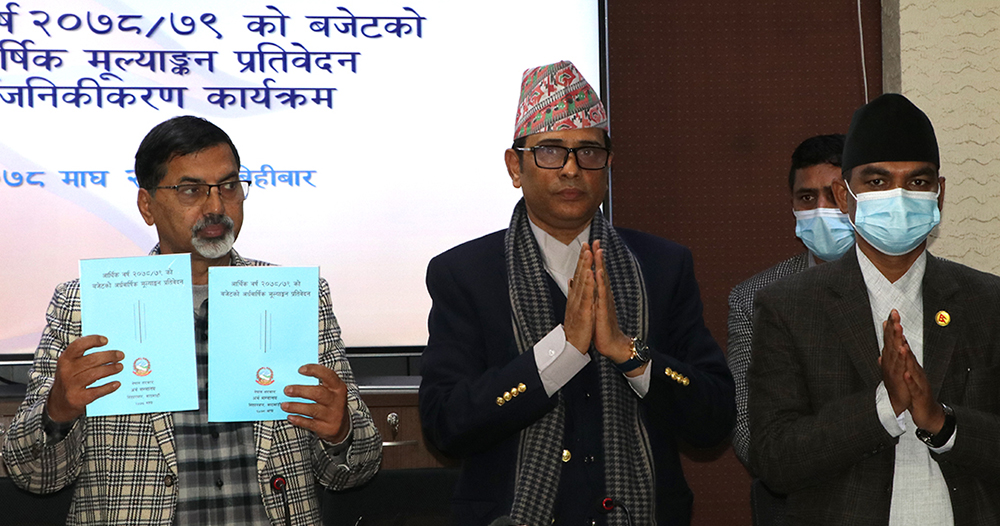 काठमाडौं । आर्थिक वर्ष २०७८/७९ को बजेटको अर्धवार्षिक मूल्यांकन तथा समीक्षा अर्थ मन्त्रालयले गरेको छ । मूल्यांकन तथा समीक्षाको प्रतिवेदन अर्थमन्त्री जनार्दन शर्माले बिहीबार सार्वजनिक गरेका हुुन् ।