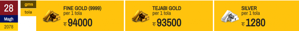 त्यसैगरी, आज चाँदीको मूल्य भने स्थिर रहेका छ । आज चाँदी १२ सय ८० रुपैयाँमा कारोबार भइरहेको महासंघले जनाएको छ । चाँदी बिहीबार पनि १२ सय ८० रुपैयाँमा नै कारोबार भएको थियो ।