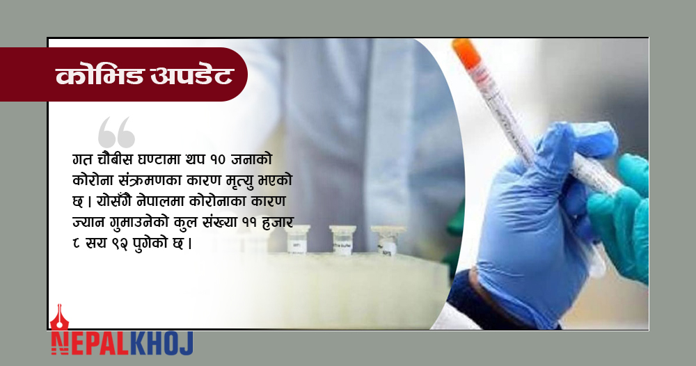 त्यस्तै, गत चौबीस घण्टामा थप १० जनाको कोरोना संक्रमणका कारण मृत्यु भएको छ । योसँगै नेपालमा कोरोनाका कारण ज्यान गुमाउनेको कुल संख्या ११ हजार ८ सय ९२ पुगेको छ । त्यस्तै, गत चौबीस घण्टामा देशभर जम्मा ५६ हजार १२ जनाले कोरोना भाइरसविरुद्धको खोप लगाएका छन् ।