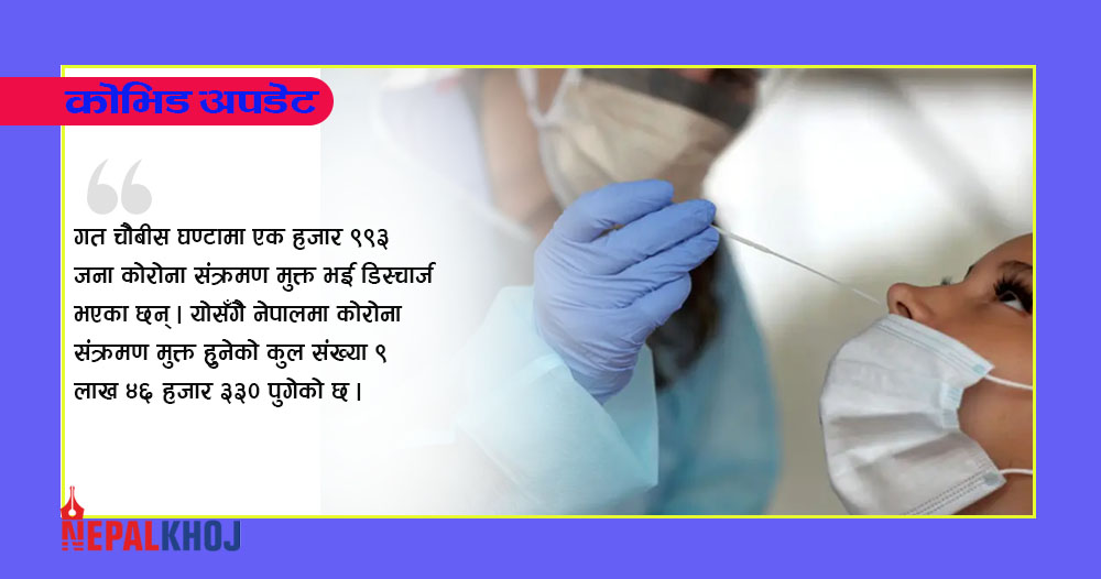 काठमाडौं । नेपालमा दैनिक कोरोना संक्रमितको संख्या एक हजारभन्दा कम हुँदै गएको छ । गत चौबीस घण्टामा १ हजार ९९३ जना कोरोना संक्रमण मुक्त भई डिस्चार्ज भएका छन् । योसँगै नेपालमा कोरोना संक्रमण मुक्त हुनेको कुल संख्या ९ लाख ४६ हजार ३३० पुगेको छ । नेपालमा कोरोना निको हुने दर ९६ दशमलव ९ प्रतिशत छ ।