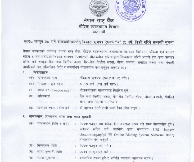काठमाडौं । नेपाल राष्ट्र बैंकले १० अर्ब रुपैयाँको विकास ऋणपत्र बिक्री गर्ने भएको छ । राष्ट्र बैंकको अनुसार फागुन ८ गते दिउँसो तीन बजे बोलकवोल हुने गरी पाँच बर्षे अवधिको विकास ऋणपत्र २०८३ ‘च’ बिक्री गर्न लागिएको हो ।