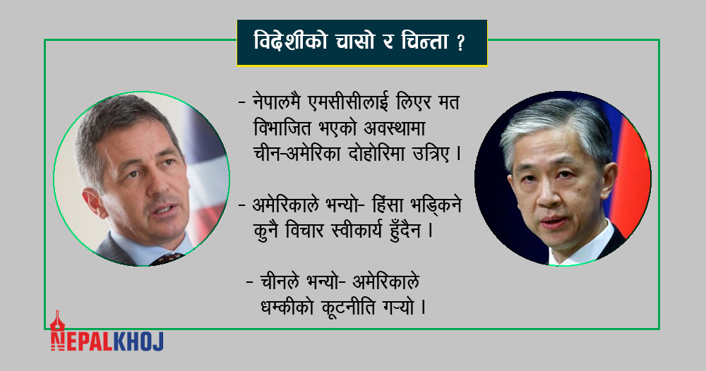 अमेरिकाले पनि हिंसा भड्किने कुनै विचार स्वीकार्य नहुने बताइसकेको छ । यता चीनले अमेरिकाले धम्कीको कुटनीति गरेको आरोप लगाएको छ । नेपालमै एमसीसीलाई लिएर मत विभाजित भएको अवस्थामा चीन-अमेरिका दोहोरीमा उत्रिए ।