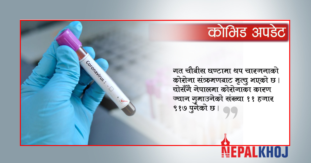 त्यस्तै, गत चौबीस घण्टामा थप चारजनाको कोरोना संक्रमणका कारण मृत्यु भएको छ । योसँगै नेपालमा कोरोनाका कारण ज्यान गुमाउनेको कुल संख्या ११ हजार ९१७ पुगेको छ । त्यस्तै, गत चौबीस घण्टामा देशभर थप ७ लाख ६९ हजार ५७६ जनाले कोरोना भाइरसविरुद्धको खोप लगाएका छन् ।