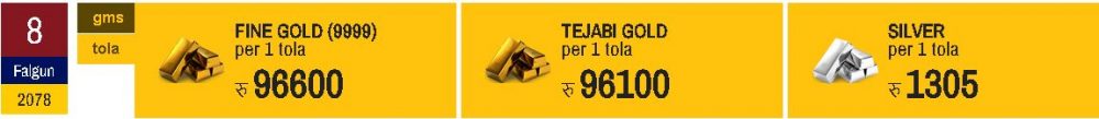 त्यस्तै, महासंघका अनुसार आज तेजाबी सुनको मूल्य पनि १ सय रूपैयाँले बढेको छ । आज तेजाबी सुन ९६ हजार १ सय रुपैयाँमा कारोबार भइरहेको छ । शुक्रबार तेजाबी सुन ९६ हजार रुपैयाँमा कारोबार भएको थियो ।