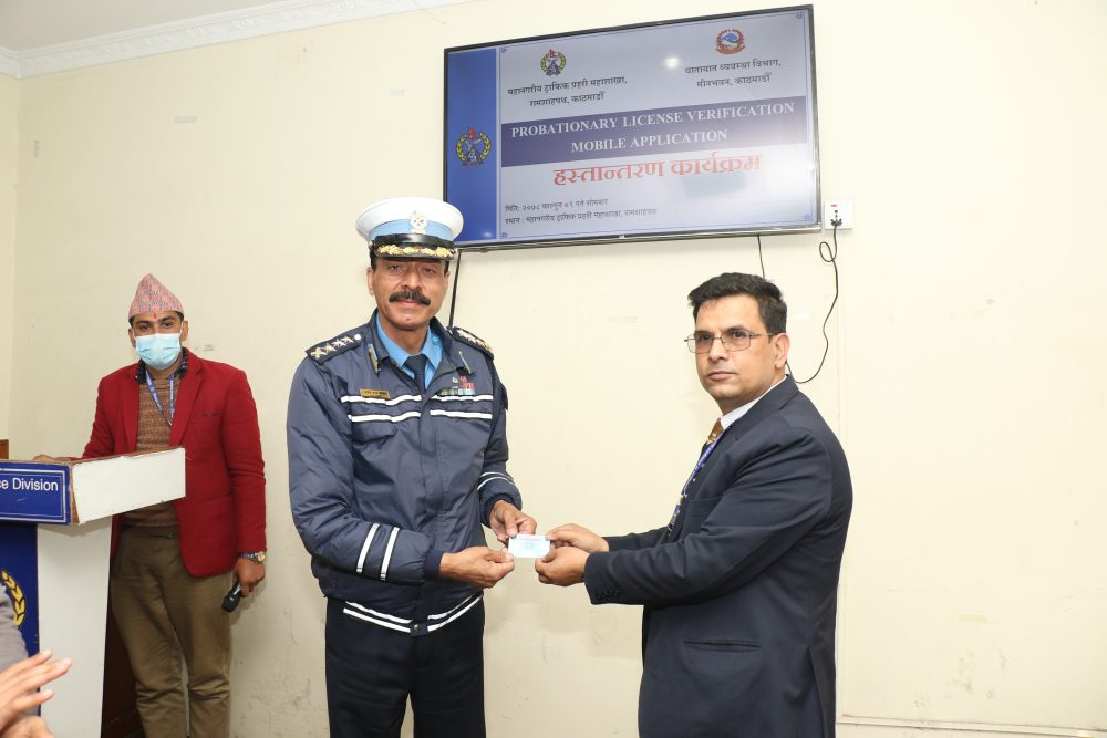 आज एक कार्यक्रमका बीच यातायात व्यवस्था विभागले नक्कली सवारी चालक अनुमतिपत्रको प्रयोगमा नियन्त्रण गर्न मोबाईल एप्सको विकास गरी महानगरीय ट्राफिक प्रहरी महाशाखालाई हस्तान्तरण गरेको हो । यातायात व्यवस्था विभागका महानिर्देशक नमराज घिमिरेले महानगरीय ट्राफिक प्रहरी महाशाखाका प्रमुख प्रहरी वरिष्ठ उपरीक्षक उमेशराज जोशीलाई लाईसेन्स भेरिफिकेसन मोबाइल एप्स हस्तान्तरण गरेका हुन् ।