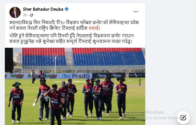 ओमानमा जारी टी–२० विश्वकप क्रिकेट छनोट खेलमा नेपाल सेमिफाइनलमा प्रवेश गरेपछि आज साँझ ट्विट गर्दै प्रधानमन्त्री देउवाले क्यानडाविरुद्ध आठ विकेटको जीत निकाल्दै ‘टी–२० विश्वकप ग्लोबल छनोट’को सेमिफाइनल प्रवेश गर्न सफल नेपाली राष्ट्रिय क्रिकेट टोलीलाई हार्दिक बधाई दिएका हुन्।