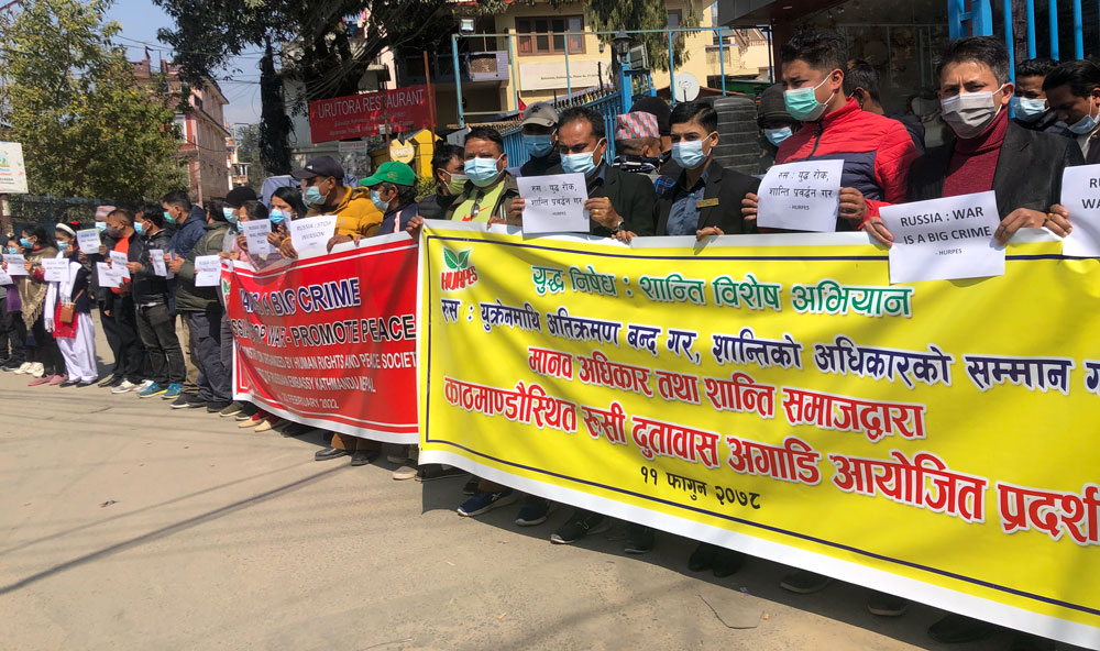 काठमाडौं । रुसलाई तत्काल युद्ध रोक्न र शान्ति प्रवर्द्धन गर्न विशेष आग्रहसहित मानवअधिकार तथा शान्ति समाजले आज (बुधबार) नेपालस्थित रुसी दूतावासअगाडि प्रदर्शन गरेको छ । दिउँसो १ बजेदेखि आघा घण्टासम्म गरिएको प्रदर्शनमा शान्तिवादीहरुले रुस : युक्रेनमाथि अतिक्रमण बन्द गर, तत्काल सैनिक फिर्ता गर, युद्ध रोक, शान्ति प्रवर्द्धन गर भन्दै ध्यानाकर्षण गराएका थिए ।