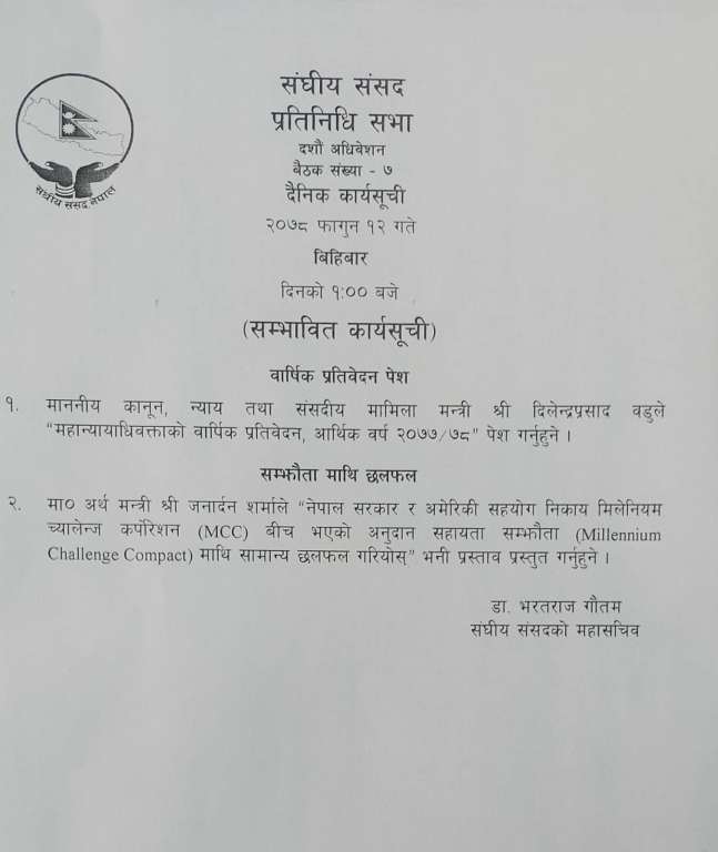 काठमाडौं । बिहीबार बस्ने प्रतिनिधिसभाको बैठकमा एमसीसीमाथि छलफल हुने भएको छ । संघीय संसद सचिवालयले आज सार्वजनिक गरेको बैठकको सम्भावित कार्यसूचीमा एमसीसीलाई समावेश गरिएको छ ।