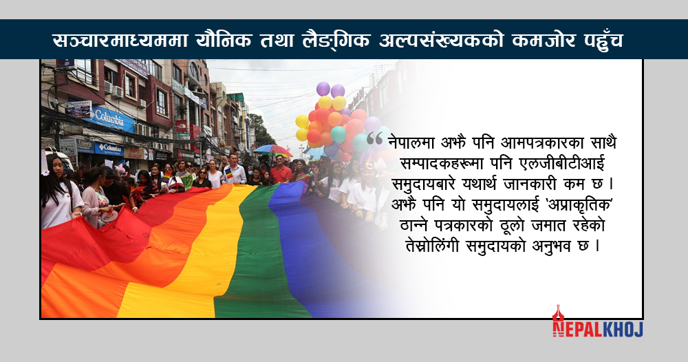 यद्यपि, नेपालमा अझै पनि आमपत्रकारका साथै सम्पादकहरूमा पनि एलजीबीटीआई समुदायबारे यथार्थ जानकारी कम छ । अझै पनि यो समुदायलाई ‘अप्राकृतिक’ ठान्ने पत्रकारहरूको ठूलो जमात रहेको तेस्रोलिंगी समुदायको अनुभव छ । जसले एलजीबीटीआईबारे बुझेको छ, उसले आफ्नो सञ्चारमाध्यममा स्थान दिने गरेको र नबुझेकाले नदिने गरेको उनीहरू ठान्छन् । ‘जसले एलजीबीटीआईबारे राम्रोसँग बुझेको छ, उसैले यो समुदायबारे निरन्तर कलम चलाइरहेको छ’, उनी भन्छिन्, ‘जसले बुझेको छैन उसले हम्मेसी लेख्दैन र लेखे पनि नबुझी लेखेको पाइन्छ ।’