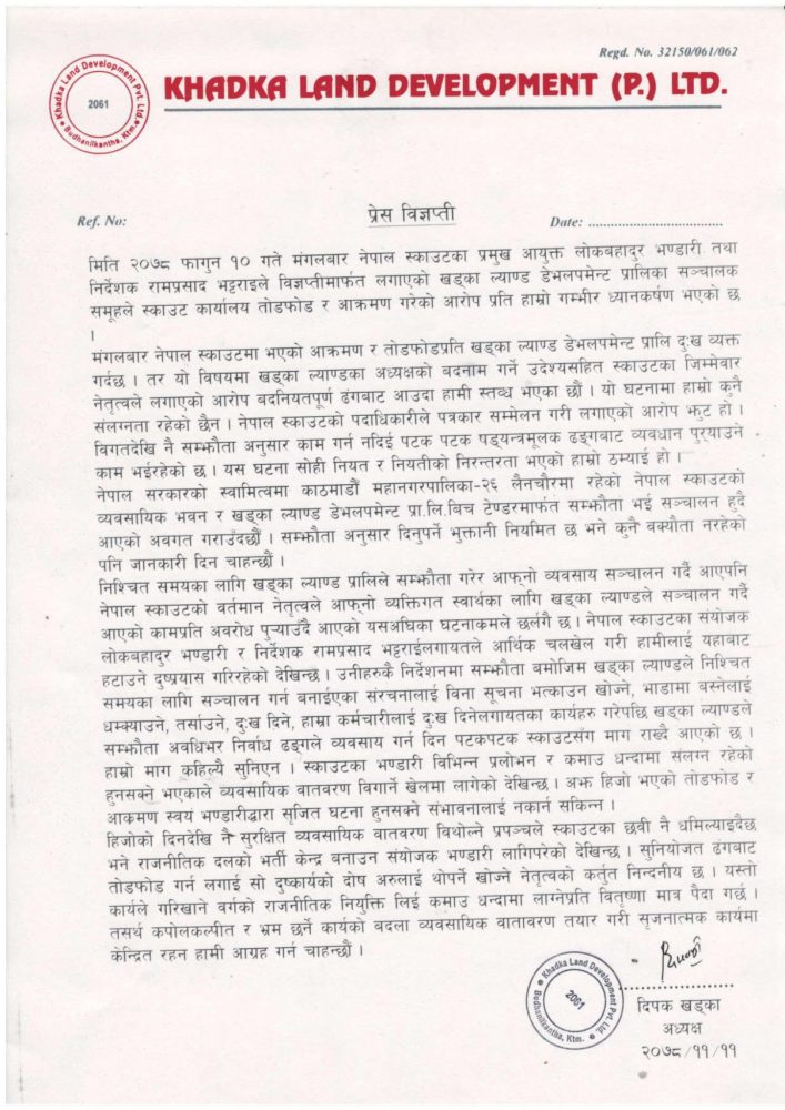 विज्ञप्तिमा भनिएको छ, ‘खड्का ल्याण्डका अध्यक्षको बदनाम गर्ने चरित्रहत्यासहित स्काउटका जिम्मेवार नेतृत्वले लगाएको आरोप बदनियतपूर्ण ढंगबाट आउदा हामी स्तव्ध भएका छौँ । खड्का ल्यान्डले नेपाल स्काउटमा भएको आक्रमण र तोडफोडप्रति दुःख समेत व्यक्त गरेको छ । खड्का ल्यान्डले घटनामा आफ्नो कुनै संलग्नता नरहेको स्पष्ट पारेको छ ।