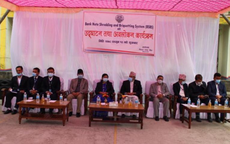 आज आयोजित कार्यक्रममा गभर्नर महाप्रसाद अधिकारीले बीएसबीएस मेसिनको स्वीच अन गरेर यसको शुभारम्भ गरेका हुन् । चलनचल्तीको निम्ति अयोग्य ठहरिएका नोटलाई जलाएर नष्ट गरिँदै आइएकोमा बीएसबीएस मेसिनको प्रयोगमार्फत स–साना टुक्रा बनाउने र स्वचालित प्रविधिबाट ब्रिकेट उत्पादन गर्ने उद्देश्यले उक्त प्रणाली अवलम्बन गरिएको हो ।