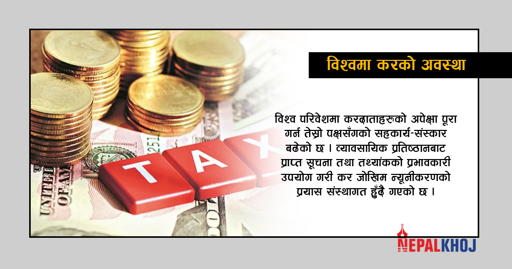 यस्तै विश्व परिवेशमा करदाताहरूको अपेक्षा पूरा गर्न तेस्रो पक्षसंँग सहकार्य गर्ने संस्कार बढेको छ । निजी तथा व्यवसायिक प्रतिष्ठानहरूबाट प्राप्त सूचना तथा तथ्यांकको प्रभावकारी उपयोग गरी कर जोखिमको न्यूनीकरण गर्ने प्रयास संस्थागत हुँदै गएको छ । नयाँ प्रविधिको प्रयोग गरी करदाताको कारोबार र सम्पत्तिसम्बन्धी आन्तरिक तथा बाह्य तथ्यांकमा पहुँच बढाइ कर छली नियन्त्रणमा प्रभावकारिता ल्याउने प्रयास भएका छन् । सानो संरचनाको कर प्रशासनबाट पनि चुस्त र प्रभावकारी सेवाको सुनिश्चितता हुनेमा विश्वास बढेको छ ।