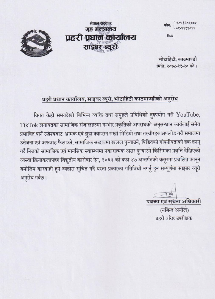 काठमाडौं । नेपाल प्रहरीको साइबर ब्यूरोले सामाजिक सञ्जालबाट भ्रामक सूचना नफैलाउन आग्रह गरेको छ । आज एक सूचना जारी गर्दै साइबर ब्यूरोले युट्युब, टिकटक, ट्वीटर, फेसबुक, इन्स्टाग्रामबाट भ्रामक सूचना फैलाए विद्युतीय कारोबार ऐन, २०६३ अन्तर्गत कारवाही गरिने समेत जनाएको छ ।