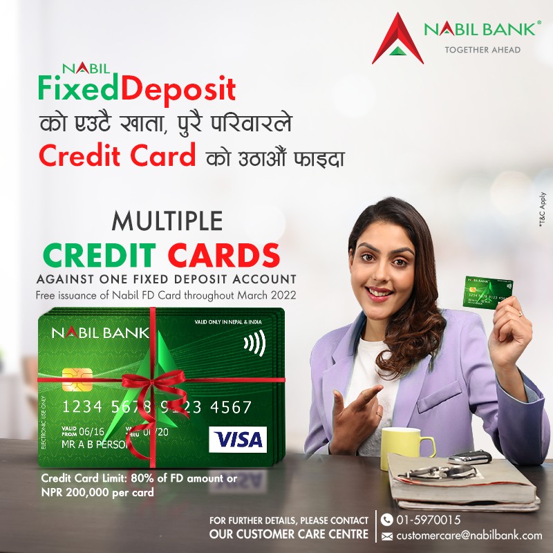 काठमाडौं । नबिल बैंकले क्रेडिट कार्डअन्तर्गत नबिल एफडी कार्ड (नबिल फिक्सड डिपोजिट कार्ड) योजना सुरु गरेको छ ।