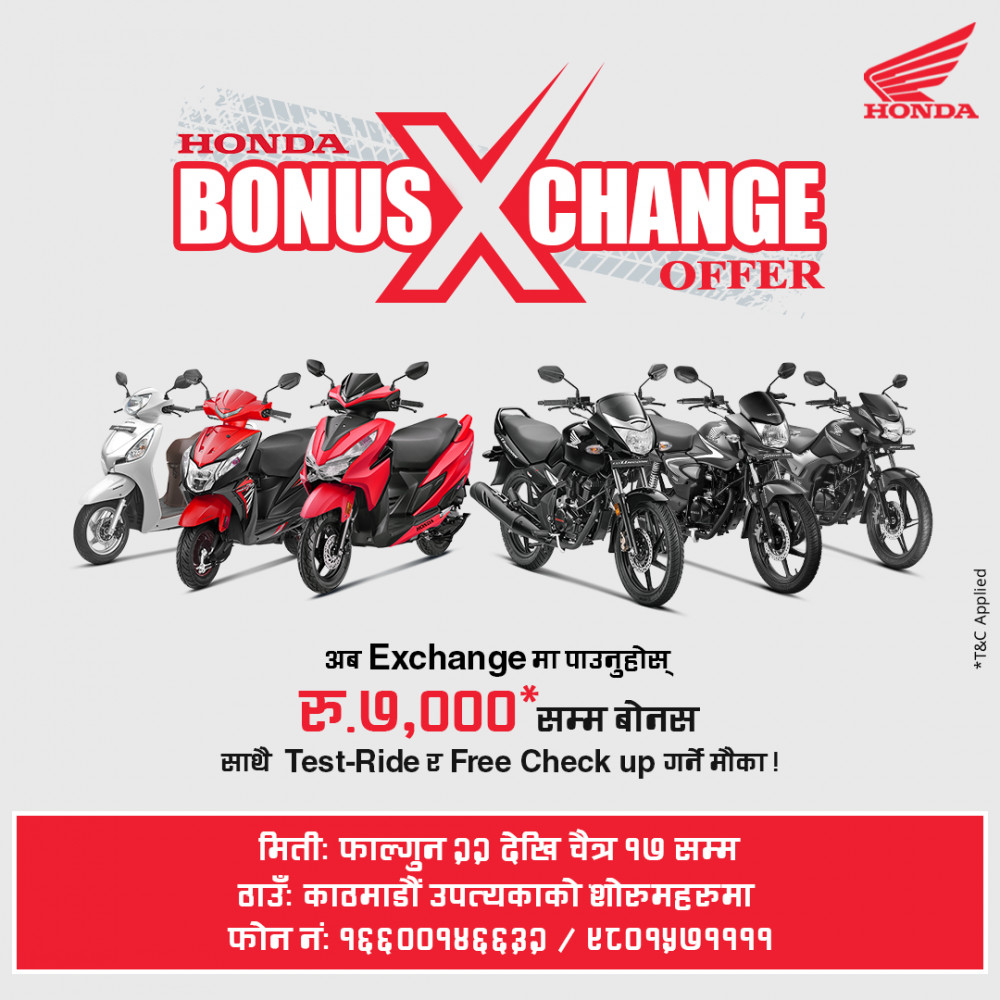 एक्सचेन्ज क्याम्पको अवधिभर ग्राहकले कुनै पनि ब्रान्डको बाइक तथा स्कुटर एक्सचेन्ज गरी होन्डाको बाइक वा स्कुटर चढ्न सक्नेछन् । ग्राहकले आफ्नो साधनको एक्सचेन्जमा विभिन्न सुविधाका साथै प्रचलित बजार मूल्यभन्दा सात हजार रुपैयाँ अतिरिक्त एक्सचेन्ज बोनससमेत प्राप्त गर्न सक्नेछन् ।