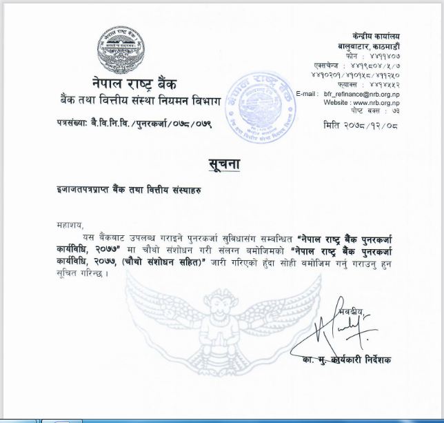 काठमाडौं । नेपाल राष्ट्र बैंकले नेपाल राष्ट्र बैंक पुनर्कर्जा कार्याविधि २०७७ को चौथौ संशोधन सार्वजनिक गरेको छ । आज राष्ट्र बैंकले अनुुमती प्राप्त सबै बैंक तथा फाईनान्स कम्पनीहरुको नाममा परिपत्र जारी गर्दै संशोधित व्यवस्था कार्यान्वयनमा ल्याउन निर्देशन दिएको हो ।