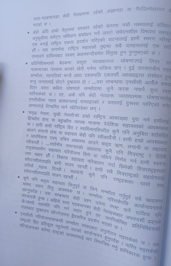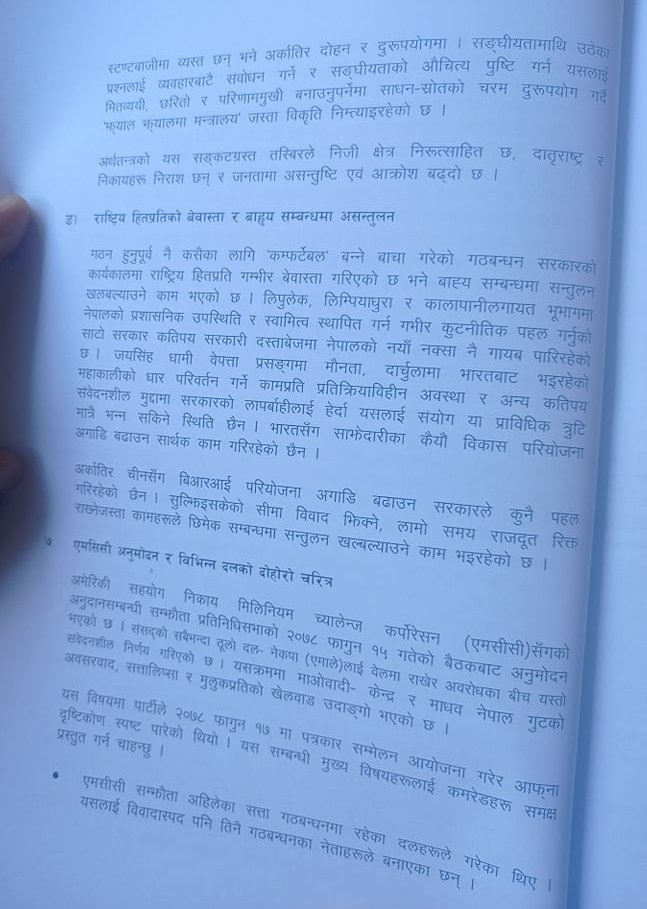 यस्तै गठबन्धनको आलोचना र एमसीसीबारे पनि पार्टीको धारणा राखेका छन् । प्रतिवेदनमार्फत ओलीले एमसीसी स्वीकार्दै अब यसमा विवाद गर्न नहुने बताएका छन् । पार्टीको बुधवारबाट सुरु भएको केन्द्रीय कमिटी बैठकमा अध्यक्ष केपी शर्मा ओलीले पेस गरेको राजनीतिक प्रतिवेदनमा पछिल्लो राजनीतिक अवस्थाको समीक्षा गर्दै गठबन्धनको मनोवैज्ञानिक भयबाट मुक्त हुन जरुरी रहेको उल्लेख छ । प्रतिवेदनमा भनिएको छ, ‘गत निर्वाचनमा पनि कांग्रेस-माओवादी गठबन्धनसँगै लडेर स्थानीय तह निर्वाचनमा एमाले एक्लैले ४२ प्रतिशत स्थानमा विजय हासिल गरेका थियाैं । निर्वाचन नेकपा एमालेको विजयको आधार सुदृढ छन्, जसलाई सम्प्रेषित गर्दै निर्वाचनमा सफलताको आत्मविश्वासका साथ जान जरुरी छ ।’