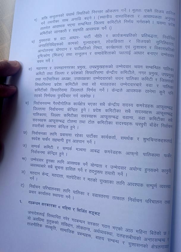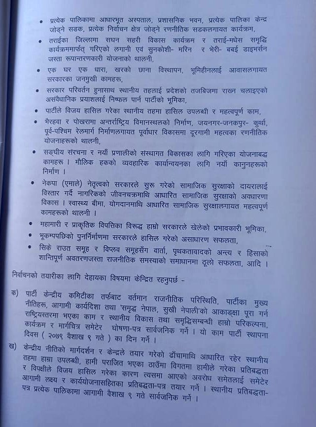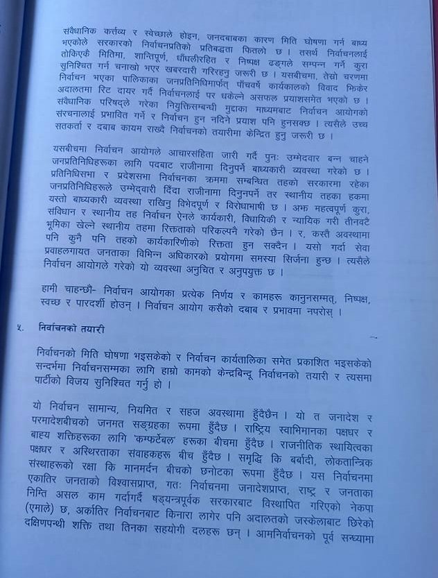 संगठनात्मक सुदृढीकरण र पार्टी काममा तीव्रता दिने र पार्टीलाई चुनावमा पहिलो शक्ति बनाउने लक्ष्य ओलीले लिएका छन् । ओलीले चुनावको मिति घोषणा भइसकेको र निर्वाचन कार्यतालिका समेत प्रकाशित भइसकेको सन्दर्भमा निर्वाचनसम्मका लागि पार्टीको कामको केन्द्रबिन्दु निर्वाचनको तयारी र त्यसमा पार्टीको विजय सुनिश्चित गर्नु भएको बताएका छन् । ओलीले एमालेको विजयका आधारमा मुख्य १८ बुँदामा समेटेका छन् ।