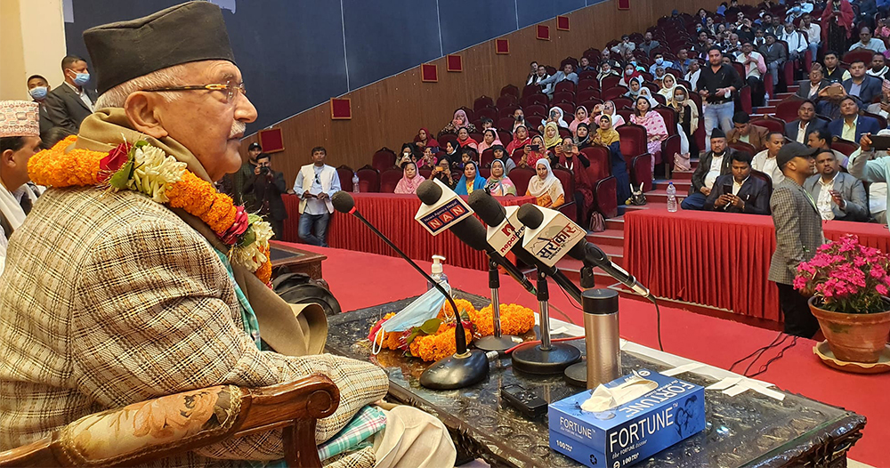 अध्यक्ष ओलीले नेकपा माओवादी केन्द्रका अध्यक्ष पुष्पकमल दाहाल प्रचण्डलाई आफुले सुधार्न नसकेको माओवादीलाई पखालेर बागमती नै मैलिएको उनले टिप्पणी गर्दै युवाहरुले अध्यक्ष दाहाललाई पत्याएर गल्ती गरेको बताए । अध्यक्ष ओलीले मुस्लिम समुदायका अगुवाहरुले मुस्लिम समुदायको पछौटेपन हटाएर जागरण ल्याउन भुमिका खेल्नुपर्ने र मुस्लिम समुदायले छोरीलाई पढाउनमा जोड दिनुपर्नेमा जोड दिए ।