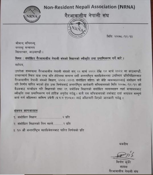 दशौँ महाधिवेशनबाट उपस्थित प्रतिनिधिहरूबाट संघको विधान, २००३ (२०२१ संशोधितसहित) को केही व्यवस्थालाई संशोधन गर्ने निर्णय भएको निवेदनमा उल्लेख छ । सोअनुसार चैत १२ गते बसेको सचिवालय बैठकबाट विधानको दफा १९ बमोजिम विधानको संशोधित व्यवस्थाहरु स्वीकृतिका लागि अनुरोध गरिएको छ ।