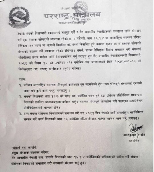 एनआरएनए विवाद चर्किँदै, घले पक्ष पुग्यो परराष्ट्र मन्त्रालय