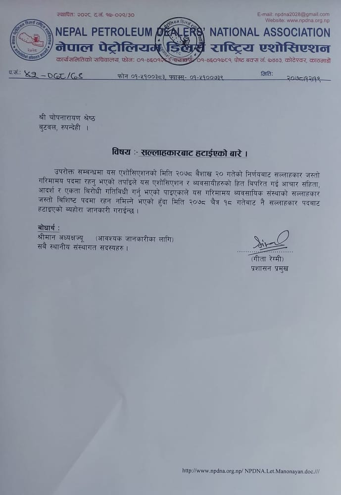 काठमाडौं । नेपाल पेट्रोलियम डिलर्स राष्ट्रिय एसोसिएसनले बुटवलका चोपनारायण श्रेष्ठलाई सल्लाहकारबाट हटाएको छ ।