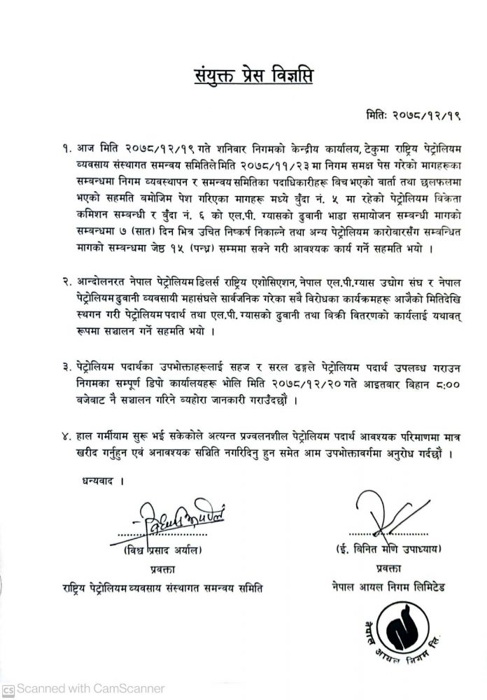 व्यवसायीसँग सहमति भएसँगै आइतबारदेखि पेट्रोलियम पदार्थको विक्री वितरण सहज हुने भएको छ ।