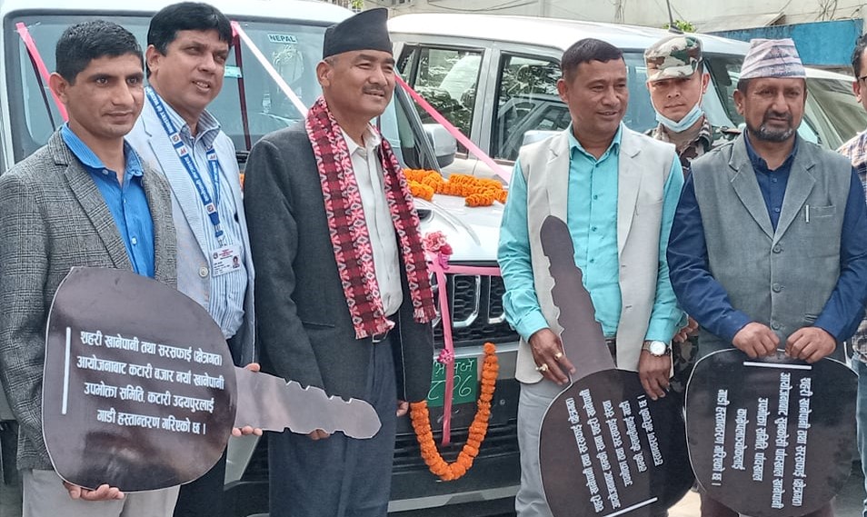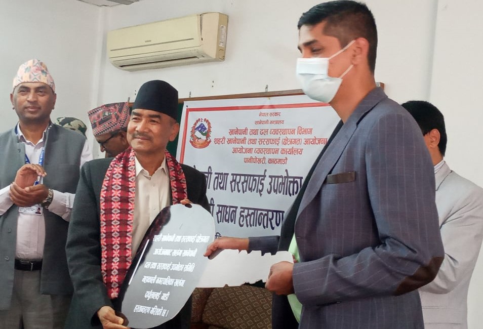नेपाल सरकार र एसियाली विकास बैंकबीच भएको ऋण सम्झौता बमोजिम साना सहरी खानेपानी आयोजनासँग गरेको खरिद सम्झौता बमोजिम ६ वटा र सहरी खानेपानी तथा सरसफाई (क्षेत्रगत) अयोजनासँग गरेको खरिद सम्झौता बमोजिम छ वटा गरी ११ वटा सवारी साधन ११ वटा खानेपानी अयोजनाको खानेपानी तथा सरसफाई उपभोक्ता समितिलाई हस्तान्तरण गरिएको हो ।