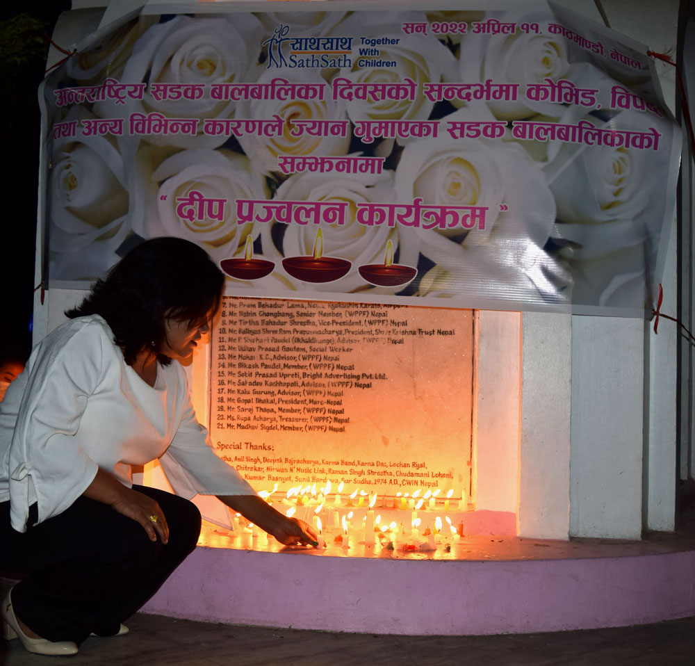 काठमाडौं । अन्तर्राष्ट्रिय सडक बालबालिका दिवसको अवसरमा साथसाथ संस्थाले कोभिड विपद तथा अन्य कारणले ज्यान गुमाएका सडक बालबालिकाको सम्झनामा दीप प्रज्जवलन गरेको छ । साथसाथ संस्थाले बालबालिको सम्झनामा यो कार्यक्रम वर्षेनी गर्दै आएको छ ।