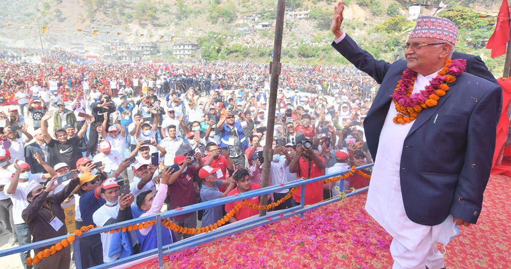 ओलीले देशभरि एमालेको पक्षमा जनलहर उर्लिएको बताए । एमालेलाई जिताउनका लागि जनता चुनावको प्रतीक्षामा रहेको उनको दाबी छ । ओलीले वर्तमान सरकारले ‘रिसाएको बिरालो’ को शैलीमा नेपाल राष्ट्र बैंकका गभर्नरमाथि कारवाही गरेको आरोप लगाएका हुन् । उनले भने, ‘आफू कमिशनखोरी गर्छ, दलाल पूँजीपतिसँग मिलेर देशको अर्थतन्त्र ध्वस्त पार्छ अनि राष्ट्र बैंकको गभर्नरलाई कारबाही गर्छ । बिरालो रिसायो भने मान्छेलाई केही गर्न सक्दैन, खाँबो चिथोर्छ । सरकारलाई एमालेसँग रिस उठेको होला, एमालेलाई केही गर्न सक्दैन अनि गभर्नरलाई कारबाही गर्छ ।’