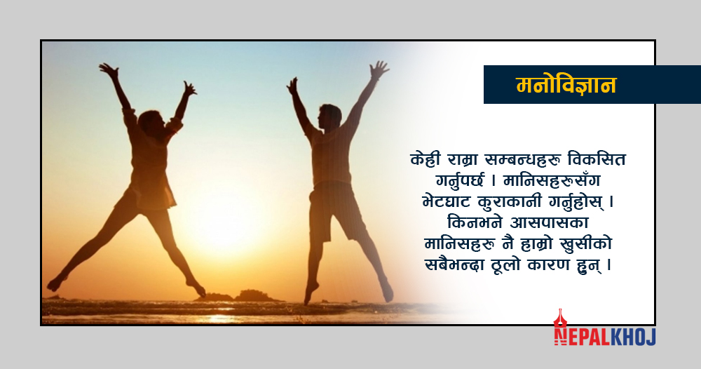 ३. केही राम्रा सम्बन्धहरु विकसित गर्नुपर्छ । मानिसहरुसँग भेटघाट कुराकानी गर्नुहोस् । किनभने आसपासका मानिसहरु नै हाम्रो खुसीको सबैभन्दा ठूलो कारण हुन् ।