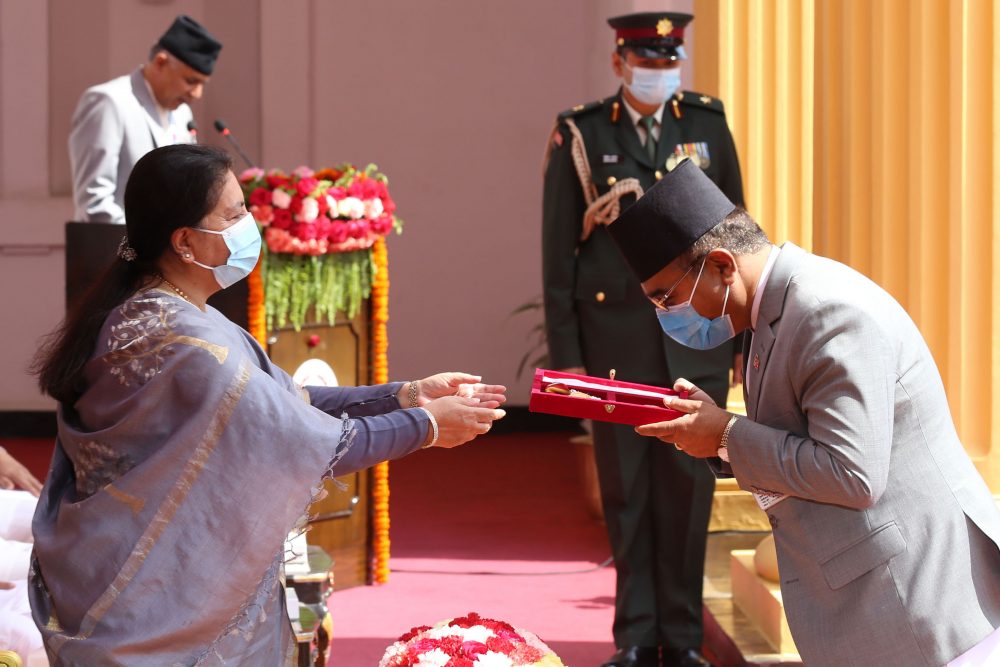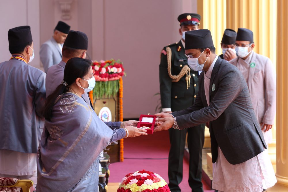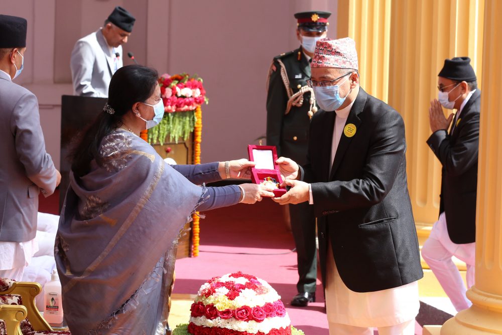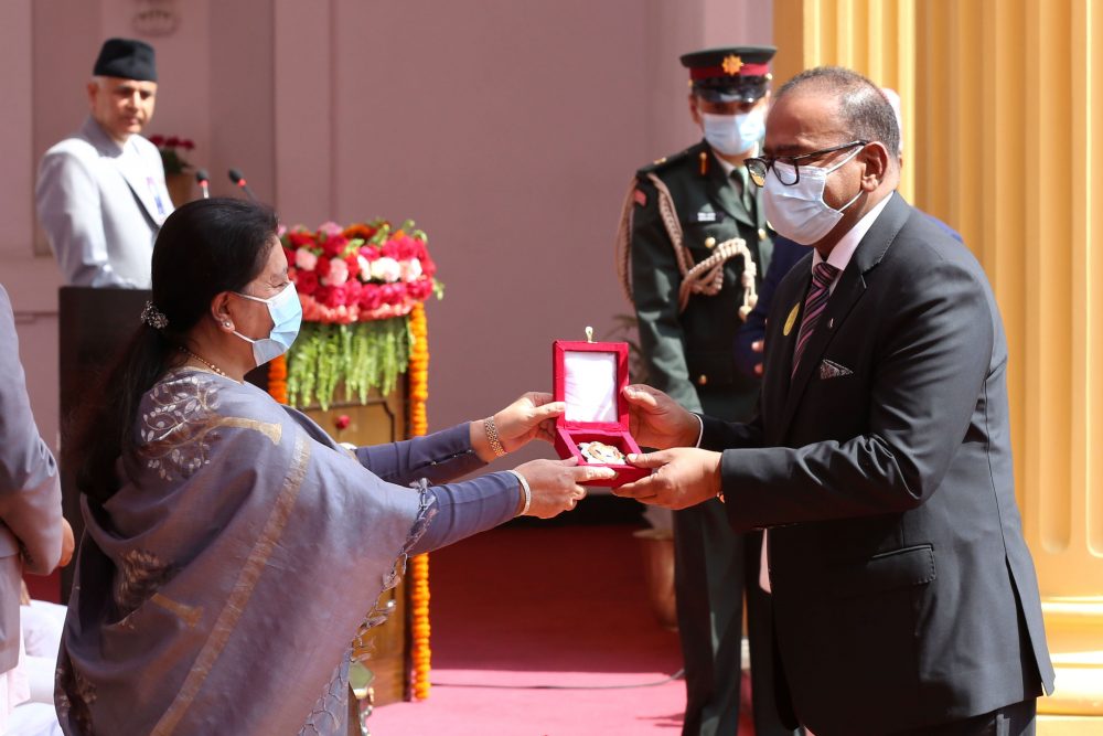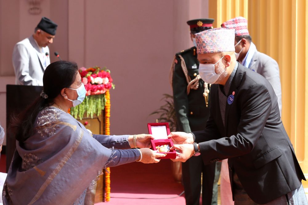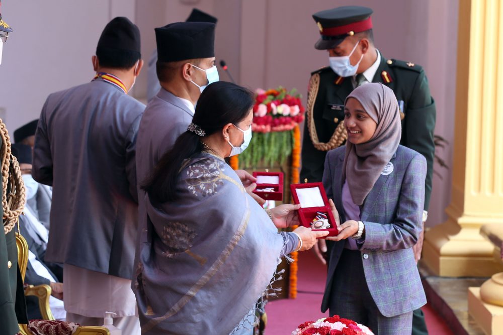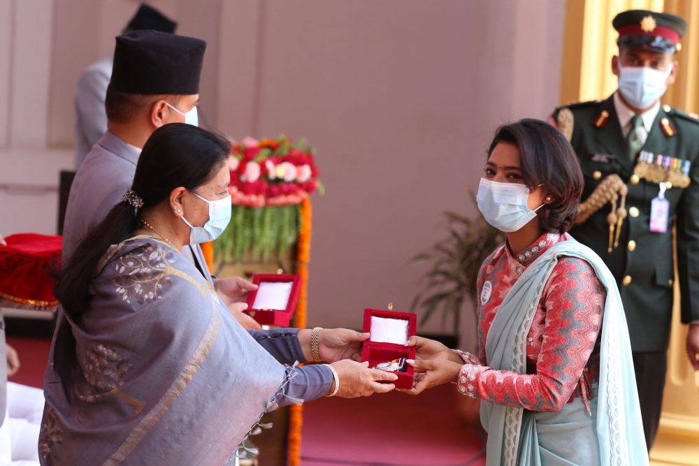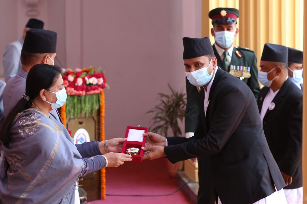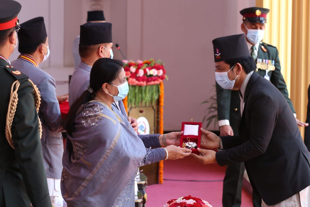 काठमाडौं । राष्ट्रपति विद्यादेवी भण्डारीले संविधान दिवस (राष्ट्रिय दिवस), २०७८ का अवसरमा घोषित विभिन्न विभूषण तथा मनपदवीबाट विशिष्ट व्यक्ति, राष्ट्रसेवक र सामाजिक क्षेत्रका व्यक्तिहरूलाई प्रदान गरेकी छन् ।