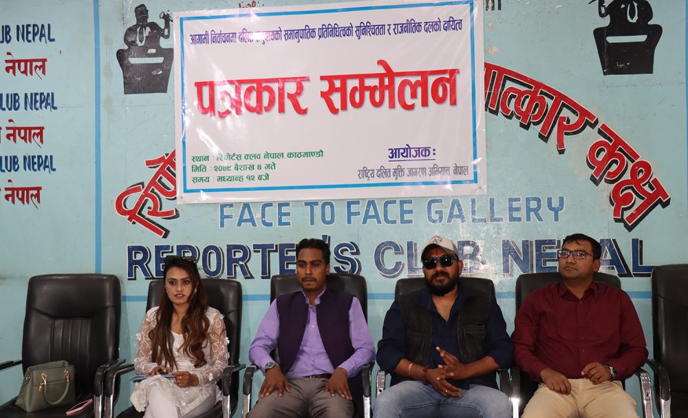 काठमाडौं । राष्ट्रिय दलित मुक्ति जागरण अभियान नेपालले आगामी स्थानीय तहका कार्यकारी पदमा दलित समुदायको प्रतिनिधित्व गराउन दबाब दिएको छ । आज पत्रकार सम्मेलन गर्दै अभियानले दलित समुदायको प्रतिनिधित्व हुनेगरि पालिका प्रमुख, उपप्रमुख, अध्यक्ष, उपाध्यक्ष र वडा अध्यक्षमा टिकट दिनुपर्ने माग गरेको हो ।