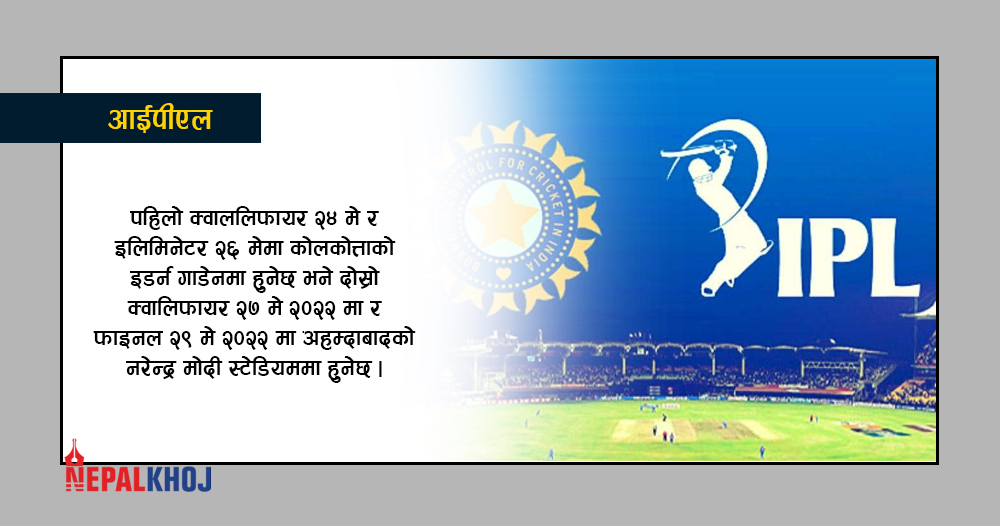 काठमाडाैं । आइपीएल २०२२ को प्लेअफ र फाइनल हुने मैदान तय भएको छ । बीसीसीआईले प्लेअफ र फाइनल हुने मैदान घोषणा गरेको हो ।