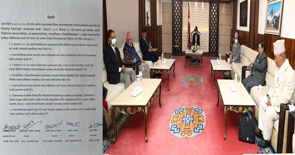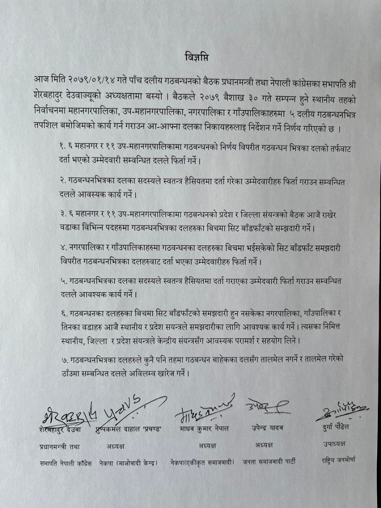 सत्ता गठबन्धनका शीर्ष नेताहरू शेरबहादुर देउवा, पुष्पकमल दाहाल ‘प्रचण्ड’, माधवकुमार नेपाल, उपेन्द्र यादव र दुर्गा पौडैलले हस्ताक्षर गरेको सो विज्ञप्तिमार्फत नगरपालिका र गाँउपालिकाहरूमा गठबन्धनका दलहरूका बीचमा भइसकेको सिट बाँडफाँट समझदारी विपरीत गठबन्धनभित्रका दलहरूबाट दर्ता भएका उम्मेदवारीहरू फिर्ता गर्न कडा निर्देशन दिइएको हो ।