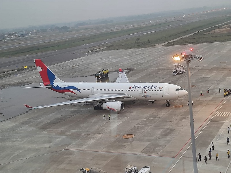 त्रिभुवन अन्तर्राष्ट्रिय विमानस्थलबाट उडान भरेर नेपाल वायुसेवा निगमको वाइडबडी जहाज गौतमबुद्ध अन्तर्राष्ट्रिय विमानस्थलमा अवतरण गरेको थियो । काठमाडौं विमानस्थलबाट बेलुका ५ः१२ मा उडान भरेको निगमको वाइडबडी जहाज ५ः५५ मा गौतमबुद्ध विमानस्थलमा अवतरण गरेको थियो ।
