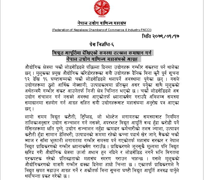मुलुकका प्रमुख औद्योगिक करिडोरहरूका सयौं उद्योगहरू दैनिक बिना कुनै पूर्व सूचना १२ देखि १६ घण्टासम्मको चर्को लोडसेडिङले थला पर्ने अवस्थामा पुुगेको भन्दै महासंघले उद्योगहरूमा ठूलो आर्थिक नोक्सानी, उत्पादकत्वमा प्रतिकुल असर पर्नुका साथै मुलुुकको अर्थतन्त्रमै गम्भीर संकट आउनेतर्फ निजी क्षेत्र चिन्तित भएको जनाएको छ ।